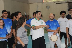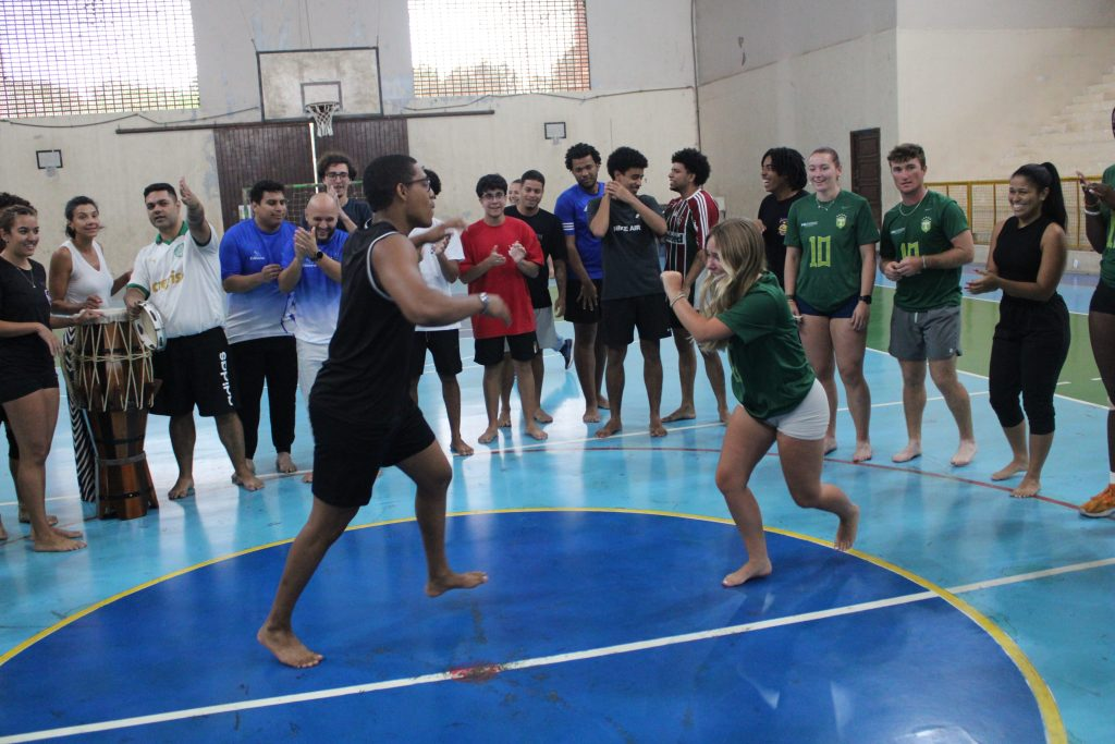 O ápice do encontro foi movido a música e a ginga. O professor Marciel Lano (DEFD) conduziu uma aula de capoeira que se transformou em uma celebração. Com a ajuda de alunos da UFRRJ que faziam a tradução simultânea, os atletas do Tennessee aprenderam os movimentos básicos – a ginga, a esquiva, os golpes. Logo depois, ao som pulsante do atabaque e do pandeiro, formou-se a roda. Em uma troca amistosa e cheia de sorrisos, os jovens atletas entraram no ritmo, experimentando na prática a energia contagiante da luta-dança afro-brasileira.
